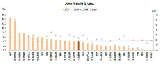 图表:A股上市公司中电子、家用电器、机械设备等对美收入敞口较高