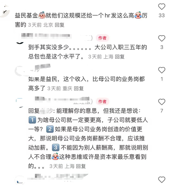 有网友说:“益民基金,就他们这规模,还给一个HR发这么高,厉害的!”有网友反驳:“到手没多少,大公司入职三五年的总包也是这水平,别光看税前。”更有扎心的评论:“才这点钱?还不如出来送外卖,4.3万到手能有多少?”
