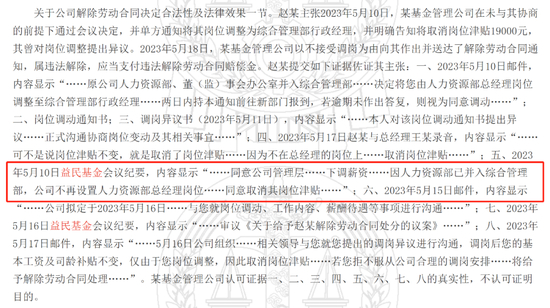 司机根据线索在裁判文书网上看到了这个公布于2024年底的《民事判决书》。判决书可以看到,赵某在益民基金干了13年,从人力资源主管一路做到人力资源部总经理,妥妥的公司“老人”。但在2023年5月,公司突然发了个《岗位调动通知书》,把他从HRD直接调到综合管理部当行政经理。