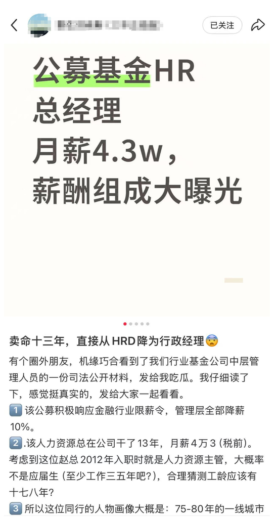 该网友称:“公募基金HR总经理月薪4.3W,薪酬组成大曝光。“”卖命十三年,直接从HRD降为行政经理。”