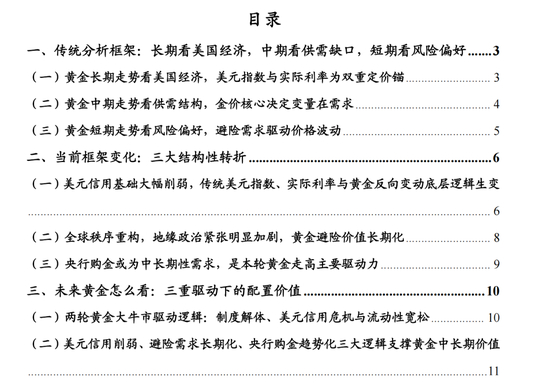 二、当前框架变化:三大结构性转折。其一,美元信用基础大幅削弱。二战后美元信用得以建立的经济规模优势、技术代差、军事开支、制度话语权四大支柱,近些年来在全球地位趋于弱化。如美国经济全球占比从1960年40%降至约25%,制造业空心化导致增加值占比从25%降至10%左右,深陷“美元霸权-贸易平衡-制造业回流”不可能三角,叠加AI技术代差缩小与军事多极化冲击,三大评级机构取消其AAA评级,传统美元指数与实际利率框架的底层逻辑已经发生变化。其二,避险属性长期化。全球产业链重构加速、地缘政治紧张明显加剧,世界进入了高风险与高不确定性的“再平衡”阶段,黄金从短期对冲工具转为长期配置刚需。其三,央行购金机制化。美债信用风险攀升及逆全球化背景下储备资产安全性和多元化需求,使央行购金成为需求端的结构性支撑。