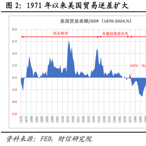 一是美国国力和地位相对优势下降。19世纪末尤其是二战以来,美国在全球的地位和作用经历了几大显著的转折变化:其一,美国经济占全球比例在逐渐下降,其GDP在全球中占比(基于购买力平价)从1890年的10%左右跃升至二战后初期的超30%,再到近10年来的15%左右;名义GDP全球占比从1960年的约40%降至2020年以来的25%左右(见图11)。其二,美国制造业空心化问题日益突出。在经历了从制造业崛起到制造业第一大国后,美国制造业空心化问题逐渐加剧,其制造业增加值占国内GDP比重和占全球制造业比重均由高点的25%左右降至了10%左右(见图12)。其三,美国债务可持续性担忧加剧。2020年疫后美国政府通过7万亿财政刺激维持经济韧性,导致财政赤字由疫前4.6%上升至6.6%,政府杠杆率居高不下(见图13);美国国债规模突破36万亿美元,占GDP比重超过120%,利息支出超国防预算占财政收入比重达13.1%。其四,美国面临着“美元霸权-贸易平衡-制造业大国”的“不可能三角”,其国内问题短期内难以解决。二战后,美国通过布雷顿森林体系确立美元霸权,形成了“美元流出——商品输入”的闭环循环。然而这一模式面临“特里芬难题”而陷入困境,美元作为国际储备货币,需同时满足全球流动性需求(通过美国贸易逆差)与维持美元与黄金固定兑换的信任基础之间的不可调和冲突,最终因美国黄金储备枯竭而崩溃,1971年布雷顿森林体系解体。此后,美国贸易逆差持续扩大(见图14),债务加重,制造业空心化,陷入了“商品输入——美元流出——债务积累”的恶性循环,最终将美国推向“美元霸权——贸易平衡——制造业大国”的“不可能三角”困境,该困境意味着解决贸易逆差和制造业空心化,并保持美元霸权地位不可兼得,美国国内问题短期内难以得到有效解决。其五,短期特朗普政策冲击加剧信用根基动摇。特朗普发动全球关税战缩减贸易逆差,却打破了“商品-美元”循环核心机制,抑制美元全球流通;政策频繁反复和不确定,导致市场预期紊乱,正系统性瓦解美元信用赖以依存的稳定性根基。