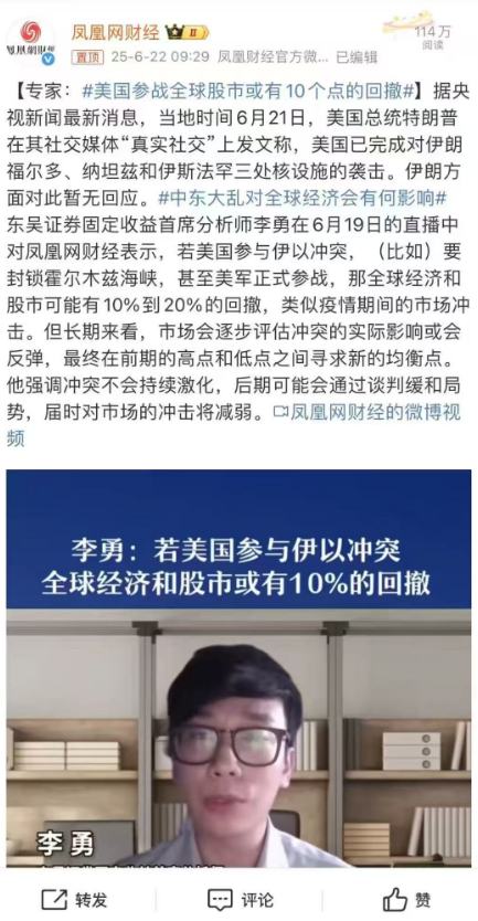 6月19日,东吴证券固收首席分析师李勇预测,若美国参与伊以冲突,全球经济和股市可能有10%到20%的回撤。