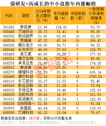 含科量较高的中小盘高成长股值得关注。证券时报·数据宝按照以下条件进行统计:包括2023~2024年研发投入占营收比例均超20%、机构评级在3家以上且一致预测2025~2027年净利增长率均超40%,共有36只个股最新市值在200亿元以下。