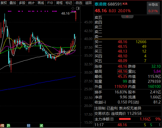 在此利好消息影响下,早盘泰凌微大幅高开,截至上午收盘,该股报48.16元,上涨20.01%,股价创出年内新高。该股甚至有望冲击上市初期的历史高点49.36元(复权后)。