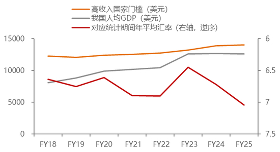 注:FY25表示该标准的使用期限为2024年7月1日–2025年6月30日,其他年份类似,每年7月1日根据上一日历年的人均国民总收入(GNI)进行更新;人均GDP使用世界银行数据,年份与设定高收入国家门槛选用的GNI统计年份相对应;汇率为该年份平均汇率