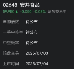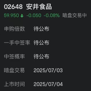 7月3日,安井食品港股暗盘交易小幅下跌,截止发稿,跌幅为0.08%,股价报59.95港元。