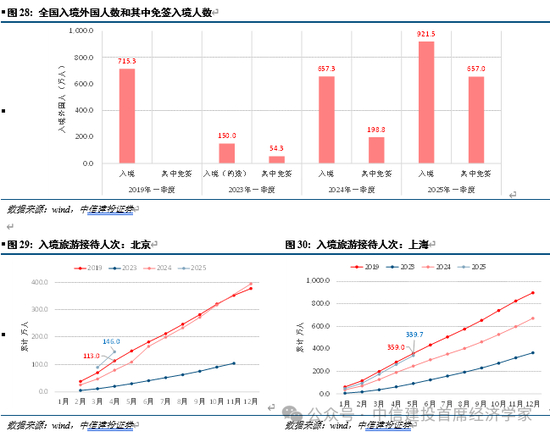 随着我国综合国力的提升,文化自信和吸引力增强,本土元素正在崛起,文化创意产品出海和外国人入境旅游繁荣。2025年一季度,全国移民管理机构累计查验出入境人员1.63亿人次,同比上升15.3%;其中,内地居民8027.2万人次、港澳台居民6572.4万人次、外国人1743.7万人次,同比分别上升15.4%、11.2%、33.4%——其中,受益于来华免签等制度性开放政策,全国和北京等重点城市的外国人入境及入境旅游人数数据,皆基本恢复至2019年同期水平或新高水平。