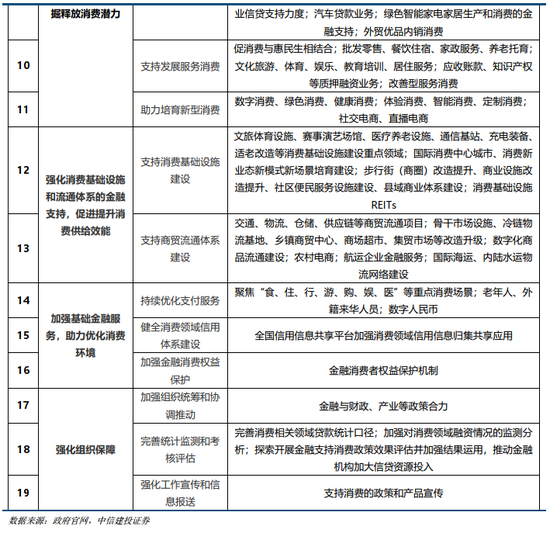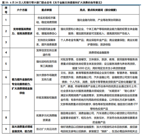 最新政策部署方面,6月24日,中国人民银行等六部门联合印发《关于金融支持提振和扩大消费的指导意见》,提出六个方面19条重点举措,从消费供给和需求两端同时着手,强化对消费重点领域的支持和培育力度。《意见》指出,要夯实宏观经济金融基础,支持居民就业增收,优化保险保障,积极培育消费需求。《意见》从支持增强消费能力、扩大消费领域金融供给、挖掘释放居民消费潜力、促进提升消费供给效能、优化消费环境和政策支撑保障等六个方面提出19项重点举措。