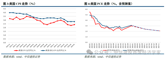 展望三季度,美国CPI有望维持稳定,降息进程或加速。一是从核心PCE走势来看,5月核心PCE回落至2.7%,联储近期对2025年PCE的预测值略下调至3%,预计2026-2027年稳步下降,显示出对通胀风险的担忧已经松动。同时,联储历史鲍曼与沃勒近期均表示,由于通胀水平低于预期,支持最早7月降息。