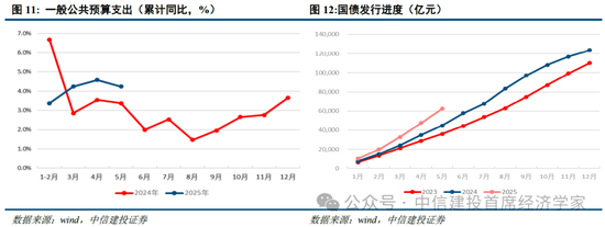 外需走弱背景下,以财政政策为主的内需政策将成下半年重要支撑。1-5月,全国一般公共预算支出112953亿元,同比增长4.2%。分中央和地方看,中央一般公共预算本级支出15792亿元,同比增长9.4%;地方一般公共预算支出97161亿元,同比增长3.4%。其中,社会保障和就业支出20054亿元,同比增长9.2%,教育、科技、节能环保、文旅等支出增速较快。从债务发行进度来看,前5个月国债和地方政府债发行速度均远超去年同期水平。