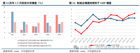 政策层面,2025年,超长期特别国债重点支持“两重”建设,并加力扩围实施“两新”政策,既为制造业技术改造和高技术产业投资提供政策保障,也成为扩大内需的重要抓手。随着“两重”“两新”政策持续推进,企业加快推进技术改造和设备更新。1—5月,全国固定资产投资同比增长3.7%,其中设备工器具购置投资大增17.3%,高技术制造业中的计算机及办公设备制造、航空航天器及设备制造等同比增速都超过20%。政策加持之下,2025年5月,规模以上工业增加值同比增长5.8%,其中,装备制造业增加值大幅增长9.0%,高技术制造业增加值增长8.6%,充分体现了以高端装备、智能制造为代表的新兴产业保持快速扩张,正在接棒传统动能,成为中国工业增长的新引擎。