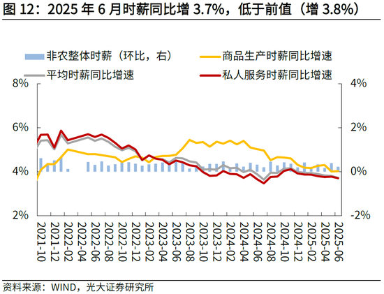 2025年6月时薪环比和同比增速均回落。环比看,2025年6月时薪环比增速为+0.2%,低于前值的+0.4%;同比看,2025年6月时薪同比增速为+3.7%,低于前值的+3.8%。