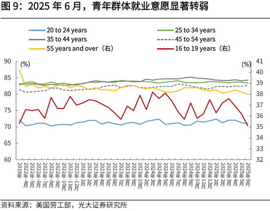 2025年6月劳动参与率回落,青年群体就业意愿显著转弱,中年群体就业意愿回升。2025年6月劳动参与率为62.3%,低于前值的62.4%。从结构来看,青年群体就业意愿转弱,16岁至19岁代表的青年群体劳动参与率环比下降1.1个百分点,20岁至24岁群体劳动参与率环比下降0.3个百分点。中年群体就业意愿回升,35岁至44岁、45岁至54岁代表的中年群体劳动参与率分别环比上行0.2、0.3个百分点。55岁以上老年群体劳动参与率环比下行0.2个百分点。
