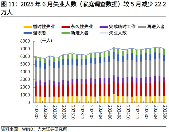 2025年6月劳动参与率录得62.3%,低于前值的62.4%,青年群体就业意愿显著转弱。从失业人口看,6月失业人口减少了22.2万人,驱动6月U3失业率(=失业人数/劳动力人数)降至4.1%。从结构看,6月永久性失业人数(减少2.9万人,前值为减少0.2万人)和完成临时性工作失业人数(减少12.2万人,前值为减少0.2万人)较上月继续回落,指向企业未显著增加裁员数量,失业人数保持稳定。此外,6月U6失业率(=(失业总人数+因经济原因而选择兼职人数)/劳动力人数)录得7.7%,低于前值的7.8%,兼职市场就业改善。