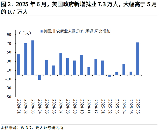 但私人部门就业转弱,也反映出关税扰动下美国经济的潜在压力,美国非农弱势渐显。一方面,6月非农数据中,相比于政府部门,私人部门表现明显偏弱,其中服务业部门新增就业明显放缓,从前值的14.1万人降至6.8万人,金融活动、专业和商业服务以及医疗等行业就业转弱,反映出关税扰动下美国经济的潜在压力,后续就业数据走势仍值得关注。另一方面,6月新增就业主要靠政府端拉动,且远超季节性趋势,政府就业快速回升后的持续性存疑,就业转弱风险依然存在。