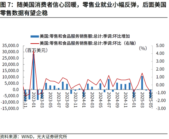 另一方面,零售业就业小幅反弹,显示本月公布的零售数据有望企稳。6月美国零售业新增就业+0.2万人,较前值的-0.7万人转正。考虑到自4月对等关税豁免后,关税对美国经济影响边际减弱,6月美国消费者信心指数也回升至60.7,也指向后续消费数据有望企稳。