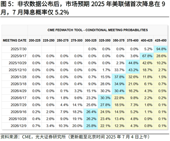 客观上看,本次非农数据高于预期,同时减税法案顺利落地,缓和经济衰退担忧,短期内美联储或继续保持观望。但考虑到美国就业市场仍在降温过程中,我们认为美联储在下半年重启降息操作的概率较大,下半年依然有2次左右的降息空间。CME Fedwatch工具显示,市场预期2025年全年美联储将降息2次,首次降息时点为9月,概率超6成,7月降息概率仅5.2%。