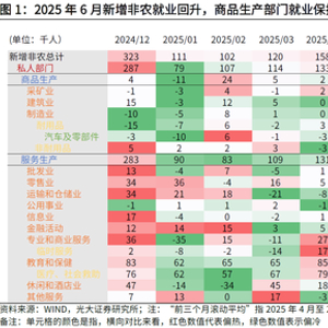 2025年6月美国新增就业回升,但仍有隐忧。一方面,从结构看,6月政府就业贡献新增就业近一半,远超季节性趋势,或因DOGE改革暂歇后的暂时性回补,持续性存疑。另一方面,相比于政府部门,6月私人部门就业转弱,服务业部门新增就业明显放缓,从前值的14.1万人降至6.8万人,反映出关税扰动下美国经济的潜在压力,不宜高估本次非农数据的韧性。