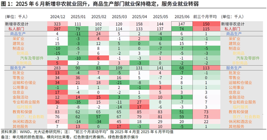2025年6月美国新增就业回升,高于市场预期。从新增就业规模看,6月非农就业人口增14.7万人,高于市场预期的增11.0万人,也高于前值的增14.4万人(修正前数据为增13.9万人),维持韧性。其中6月服务业新增就业从前值的14.1万人降至6.8万人,商品生产部门新增就业保持稳定,6月新增就业0.6万人,高于前值的-0.4万人。