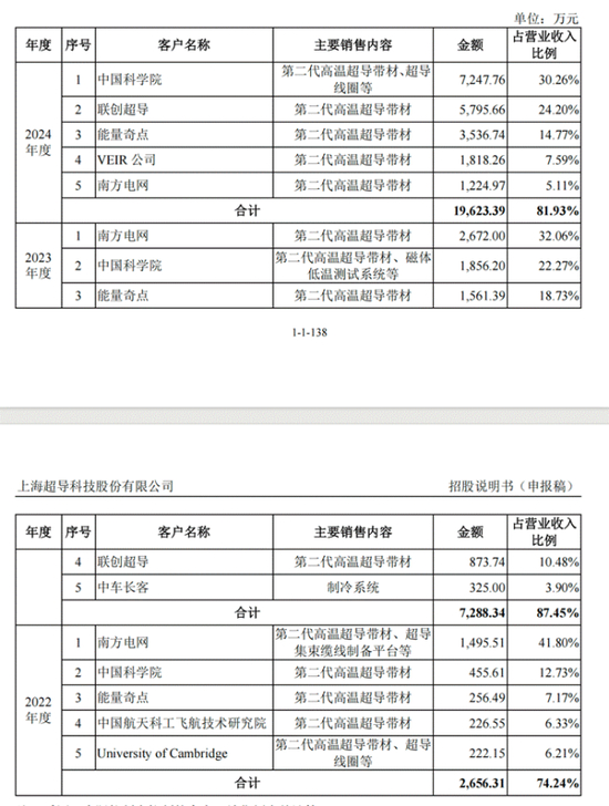 从招股书披露的数据来看,2022-2024年,上海超导前五大客户贡献的收入占比分别达到74.24%、87.45%、81.93%,,连续三年维持在 80% 左右的高位。这种客户集中程度远超新材料行业平均水平——据Wind数据显示,A股新材料板块公司前五大客户平均收入占比通常在30%-50%区间,而上海超导的这一指标是行业均值的1.6-2.5倍。其中,2024年第一大客户中国科学院贡献收入7247.76万元,占全年营收的30.26%;2023年南方电网以2672万元收入占据32.06%的份额,2022年该比例更是高达41.8%。