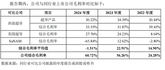 但需要看到的是,同行业中,西部超导的综合毛利率近三年保持在31.87%-39.45%之间,美国超导在8.04%-27.76%之间,而韩国SuNAM 更是在2024年度录得-65.84%的毛利率,由此不难看出,上海超导2024年60.52%的毛利率在行业中显得格外突出,其可持续性存在较大疑问。