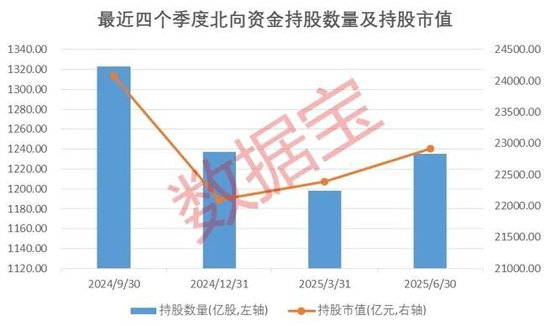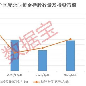 从整体持股占比来看,2025年二季度末,北向资金持股数量占沪深A股流通股本比值为1.74%,环比增加0.04个百分点;持股市值占沪深A股流通市值比值为2.81%,与一季度末比,略微下降近0.04个百分点。