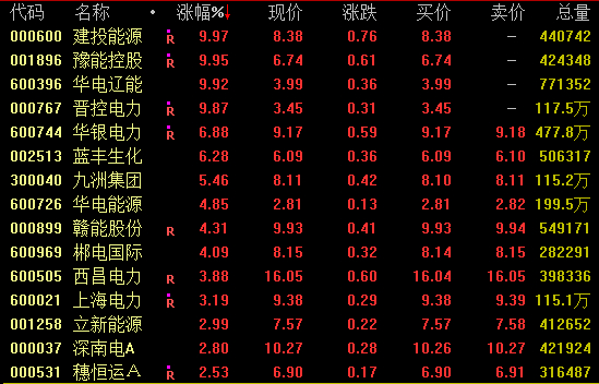 电力板块再度走强,截至收盘,建投能源、华电辽能、晋控电力涨停,豫能控股连续两日涨停,华银电力、蓝丰生化涨超6%。