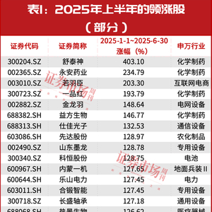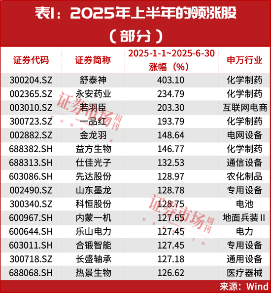 笔者特以上半年的领涨主线与个股为切入点进行分析,以作为下半年机会的重点参考。整体来看,上半年领涨的主线多点开花,比如行业类,有色金属、国防军工、传媒、机械设备、医药生物、化工、计算机等强势领涨,涨幅均超13%。再如概念类,印制电路板(PCB)、光芯片、宠物经济、PEEK材料(聚醚醚酮)、跨境电商、商业航天、军工信息化等涨幅居前,涨幅均超20%。从个股来看,上半年领涨且实现翻倍的个股有超过百只(见表1)。