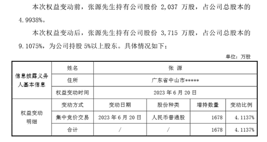 这一系列波动与一位名为张源的股东密切相关。2023年6月20日晚间,光一退发布的《简式权益变动报告书》显示,张源于当日通过集中竞价方式增持1678万股,占公司总股本的4.1137%;增持后,张源共计持有3715万股,占公司总股本的9.1075%,持股比例突破5%。