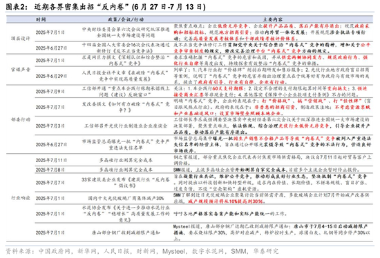 钢铁、水泥、光伏玻璃、多晶硅、建筑等行业近期积极响应,在加强行业自律方面发挥作用。7月1日Mysteel报道,唐山部分钢厂近期已收到减排限产通知,于7月4-15日启动减排限产措施,要求限产30%。截至7月7日,唐山钢企高炉共计检修16座,日均铁水较去年同期减少0.23%。水泥协会7月1日发布《关于进一步推动水泥行业“反内卷”“稳增长”高质量发展工作的意见》,呼吁将严格落实备案产能和实际产能统一作为水泥行业“反内卷”的重点工作。7月1日SMM报道,多数光伏玻璃企业计划7月开始减产改善供应端,减产规模预计将从10%提高到30%。7月8日SMM报道,主流多晶硅企业开始测算本企业完全成本,多个主流企业暂停报价,后续或将基于成本报价。7月8日央视报道,33家建筑类企业联合发出建筑行业“反内卷”倡议书,共同推动行业转型,摒弃“内卷式”竞争。总体看,不少困境中的行业积极响应“内卷式”竞争治理的形势已经出现。但另一面,行业内部的声音是多种多样的,治理“内卷式”竞争仅仅依靠行业自律可能是不够的,针对性的政策以及有效落实可能仍然是不可或缺的环节。