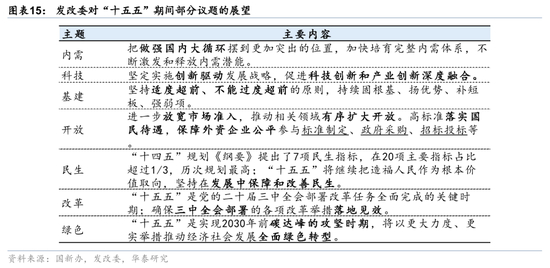 发布会上,发改委对“十五五”期间,内需、科技、基建、开放、民生、改革和绿色发展等提及的重要议题进行了方向性的展望。明确了“十五五”期间:1. 做强国内大循环摆到更突出的位置;2. 坚持创新驱动,科技创新和产业创新深度融合;3. 基础设施建设坚持适度超前但不过度超前原则推进;4. 进一步推动相关领域有序扩大开放并保障外资企业公平采育标准制定、政府采购和招投标等;5. 坚持在发展中保障和改善民生;6. 确保三中全会部署的改革措施落地见效;7. 更大力度和更实举措推动经济社会发展全面绿色转型。