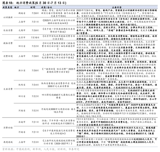 7月初以来,各地继续围绕“以旧换新”“文旅促销”“消费券发放”等重点方向加大政策力度,提振重点领域消费。湖南、上海出台电动车、家电等品类的以旧换新补贴新规,进一步明确补贴细则和领取频次;无锡围绕青年、多孩、人才等群体发放多类型购房消费券,拓宽政策适用人群;北京、四川相继发布提振消费专项方案,强调提升服务体验、延伸消费链条,四川提出108条具体举措,涵盖入境、住房、汽车等多种新兴消费场景。