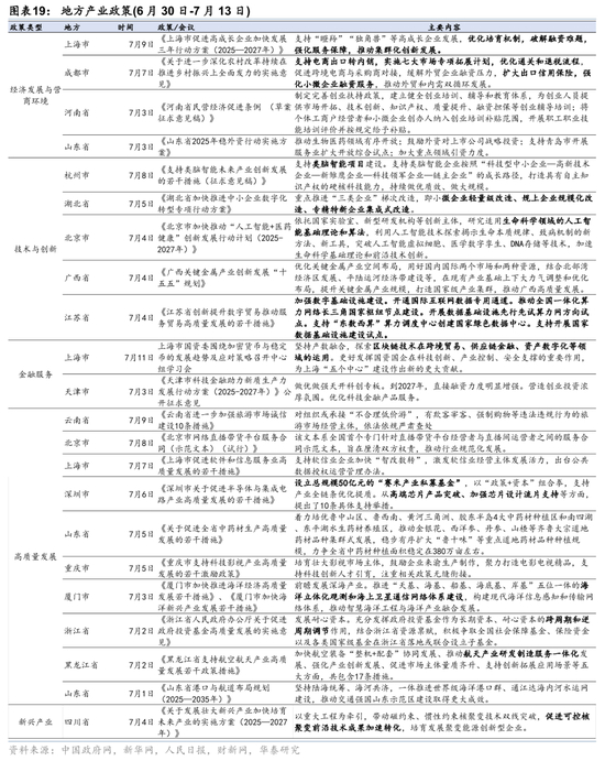 各地围绕高质量发展和新质生产力加快推出系列产业政策,重点聚焦高成长企业培育、先进制造与数字技术发展、营商环境优化和消费场景拓展。上海、北京、天津等地支持“人工智能+医药”“科技金融”等融合方向,强化高端要素保障;浙江、江苏、广西等推动数字基础设施、关键金属、政府基金布局,夯实产业底座;四川、深圳、厦门等着力发展聚变能源、半导体、海洋等新兴领域;河南、成都、山东则兼顾民营经济、乡村振兴、港口航道等传统板块的现代化升级。整体看,地方政策呈现“技术+资本+场景”协同发力特征,助力产业链优化升级与未来产业培育加速落地。