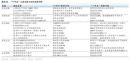 “十四五”规划设定了20项具体目标,涵盖了经济发展、创新驱动、民生福祉、绿色生态和安全保障等6个领域。7月9日的会议上,发改委回顾了其中18项具体目标截至2024年的进展,基本都符合预期或超预期(图表14)。成为世界经济增长的主要贡献者研发投入强度达到OECD国家平均水平大国重器继续取得突破、保跨省结算落地新增森林面积贡献全球新增绿化25%绿电发展快速、单位GDP能耗4年累计下降11.6%雅万高铁等共建“一带一路”合作取得里程碑进展等是4年以来取得的重要成绩。