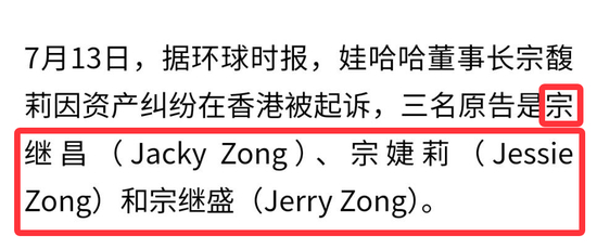 去年有三个姓宗的美国人控告宗馥莉,挪用了本属于他们的家族信托基金,跳出来说:啊啊啊我们是宗庆后的孩子,这笔信托也是留给我们的,我们仨才是受益人!把宗馥莉给告了,要求冻结这个账户。