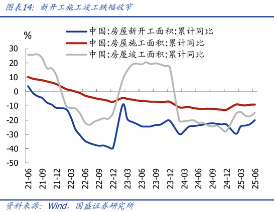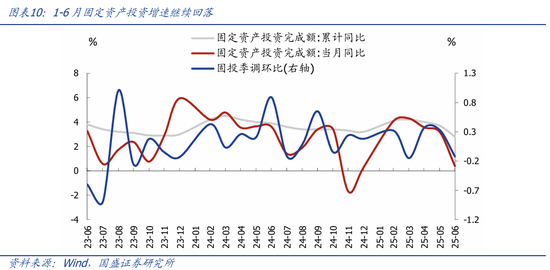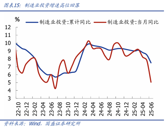 >制造业投资加速回落,“反内卷”影响初步显现。1-6月制造业投资累计同比7.5%,较前值回落1个百分点,6月当月同比5.1%,较前值回落2.7个百分点;应是与“反内卷”限产、出口回落预期有关。企业投资意愿维持低位。分行业看,有色、医药、电子设备等行业投资增速回落较多,这也是我们前期报告分析中,内卷压力较大的行业。(具体请参考《调整就是机会—2025年中期经济与资产展望》中观面专题一:四大维度对比各行业“内卷”压力)。