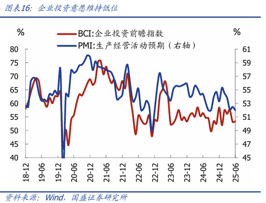 制造业投资加速回落。1-6月制造业投资累计同比7.5%,较前值回落1个百分点,6月当月同比5.1%,较前值回落2.7个百分点;应是与“反内卷”限产、出口回落预期有关。企业投资意愿维持低位,6月BCI企业投资前瞻指数微升0.1个百分点至53.4%。
