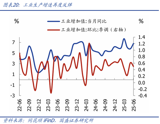 工业生产增速再度反弹。6月工业增加值同比6.8%,较前值回升1.0个点,高于市场预期的5.5%;6月工业增加值季调环比0.5%,较5月的0.61%回落;工业生产再度反弹,主要应是受到出口反弹的支持。