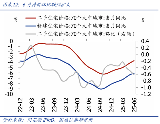 1-6月地产销售额、房价环比跌幅扩大。1-6月商品房销售面积、销售额同比分别为-3.5%、-5.5%。6月70城二手房价同比跌幅收窄至-6.1%,但环比跌幅扩大至-0.6%,其中一线城市二手房价环比-0.7%,指向地产量价均再度下行。