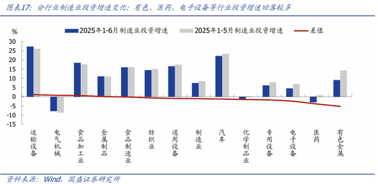 分行业看,仅运输设备、电气机械等行业投资增速小幅回升,其余行业多数回落,其中有色、医药、电子设备等行业增速回落较多,这也是我们前期报告分析中,内卷压力较大的行业(具体请参考《调整就是机会—2025年中期经济与资产展望》中观面专题一:四大维度对比各行业“内卷”压力)。