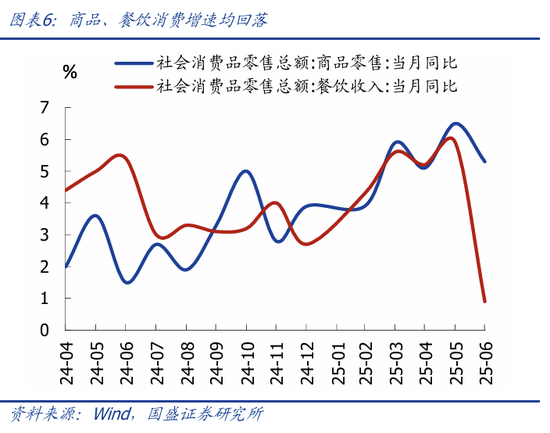 >服务消费方面,6月餐饮收入同比降至0.9%,较前值大降5个百分点,可能与5月下旬以来多省严查违规吃喝有关。1-6月服务零售额累计同比微升0.1个百分点至5.3%。