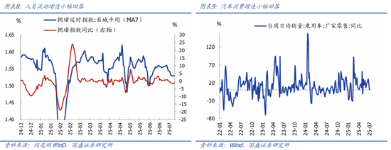 从近期高频数据看,人员流动、汽车消费增速小幅回落。从高频看,2025年7月上旬,百城拥堵延时指数增速小幅回落;7月第一周乘用车零售同比降至1%。