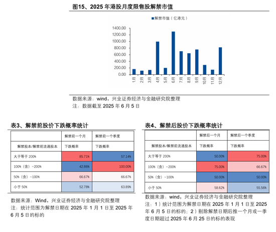 3)微观层面,关注限售股解禁是否会给当前火热的次新股行情降温。往后看,2025 年 6 月至 9 月将迎来解禁高峰期,港股市场解禁市值分别高达 1295 亿港元、703 亿港元、642 亿港元、756 亿港元。数据显示,解禁往往引发解禁日前后股价回调压力,尤其对于解禁股本占解禁前流通股本比例较高的标的,市场抛压可能更为显著。