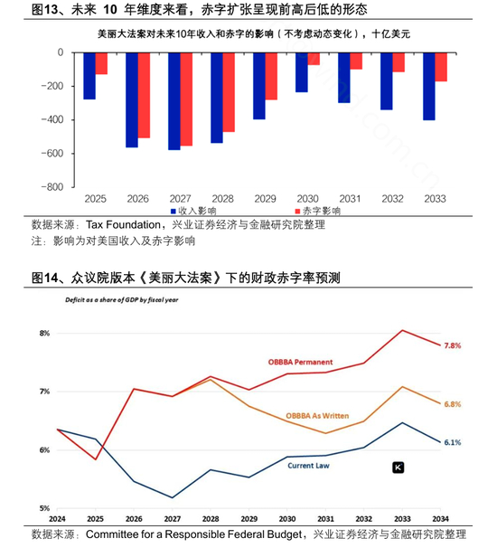美国减税法案通过和债务上限提高后,供给增加压力美债长端利率有向上风险。众议院通过《美丽大法案》,投资者已经基本确定美国的赤字不仅不会得到控制,还会进一步加剧。在众议院版本的《美丽大法案》中,减税前置,而缩减开支的措施被明显后置。根据Committee for a Responsible Federal Budget 估计,2026财年的赤字率会上升到7%左右。由于参议院更具宽松倾向,参议院版本如果进一步加大赤字,那么投资者将更加担心财政政策走向失衡。另外,债务上限解决后,补偿性发债需求也将进一步推升长债的供给压力。