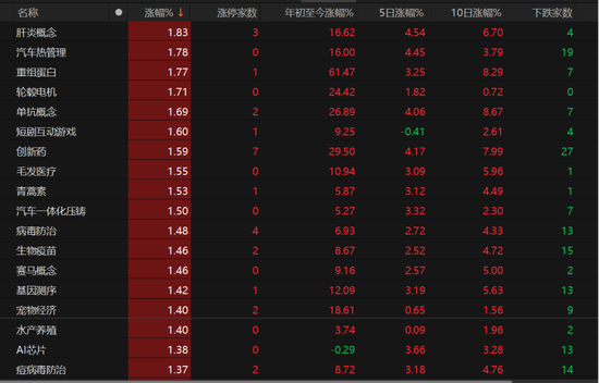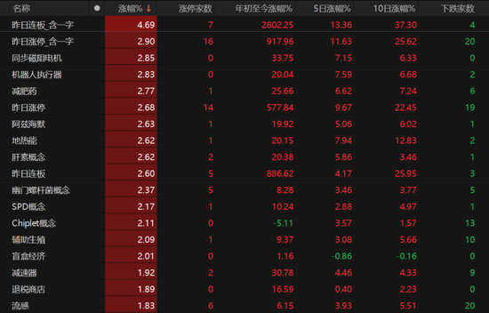 同步磁阻电机、机器人执行器概念板块涨幅近3%,减肥药、阿兹海默、地热能、肝素概念涨幅也较为可观。Chiplet概念、汽车热管理、轮毂电机、创新药、AI芯片也表现不错。