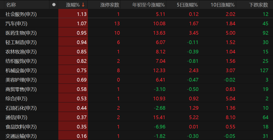 板块收跌居多,31个申万一级行业中有14个收涨,社会服务、汽车、医药生物、轻工制造、农林牧渔、纺织服饰、机械设备板块均涨约1%。昨日大涨的通信板块今日微涨。