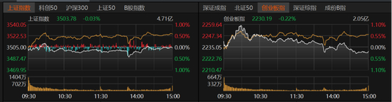 沪指在3500点附近震荡,盘中一度失守3500点,最后微跌0.03%报3503.78点;创业板指微跌0.22%报2230.19点;深证成指微跌0.22%。沪深300、上证50微跌,科创50、北证50微涨。