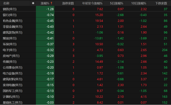 飘绿板块居多,但跌幅相对温和。钢铁、银行、有色金属、非银金融等周期板块跌幅靠前。电子、计算机板块微跌。