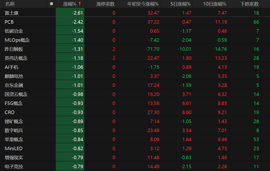 富士康、PCB概念跌幅超过2%,低碳冶金、MLOps概念、英伟达概念、AI手机、麒麟电池跌幅均超过1%。